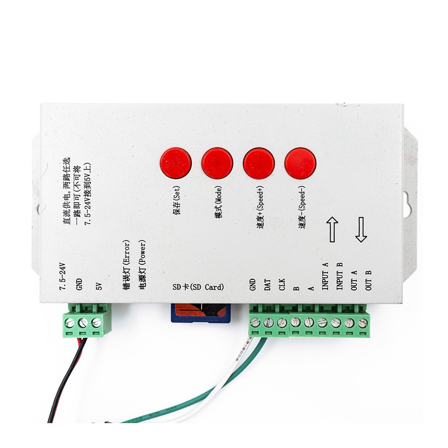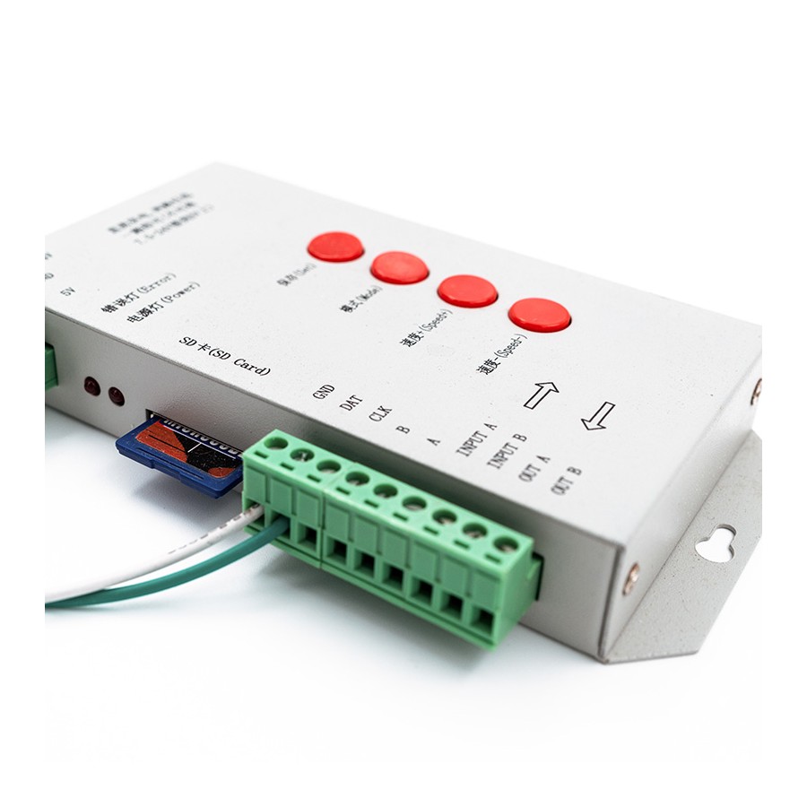 Controlador PIXEL LED para até 2048 pixéis. Pode configurá-los um a um ou por grupos. Cria efeitos ou reproduz imagens ou vídeos espetaculares. Inclui uma memória SD de 128MB. Suporte DMX512