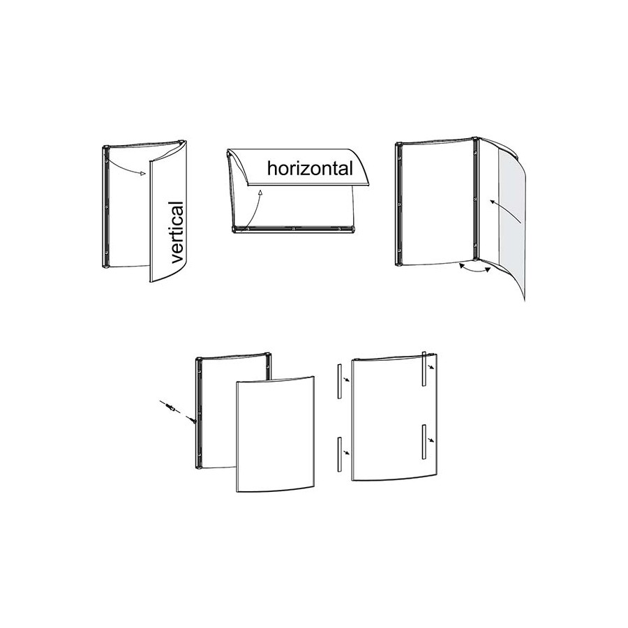 É um expositor sem moldura e ideal para o tipo de informação que tem de ser mudada frequentemente. O painel frontal pode ser aberto em quaçquer direcção e removido completamente só com um simples puxar nos cantos do acrílico.