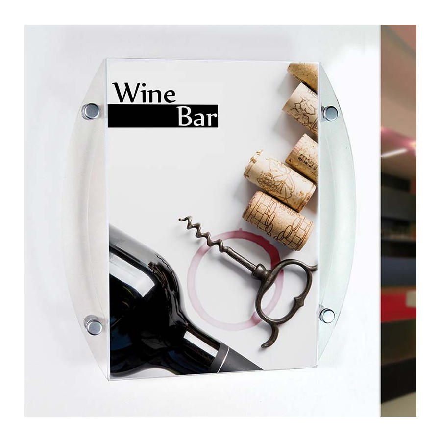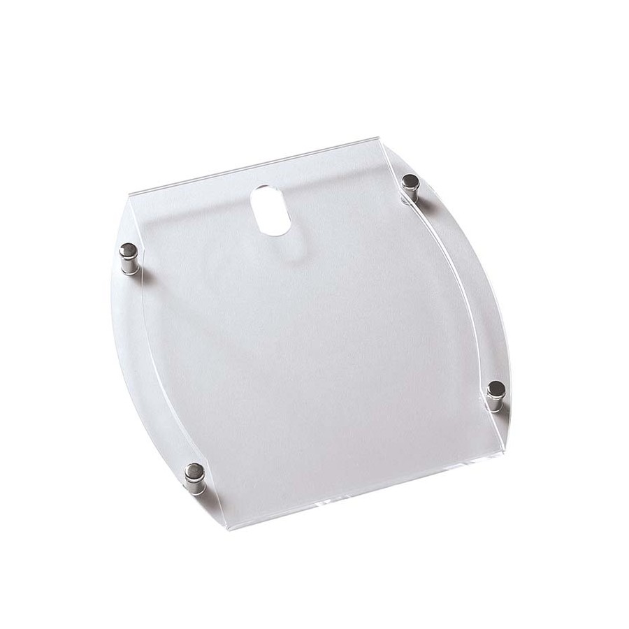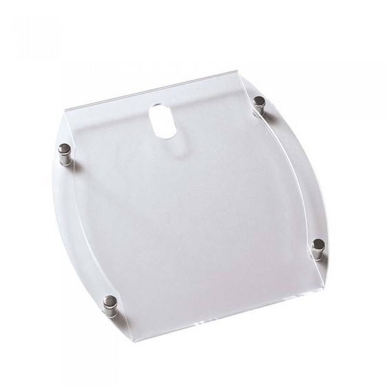O conjunto consiste num bolso de plexiglas nos 4 formatos mais comuns e 2 ou 4 espaçadores midi em prata acetinada ou cromo polido. O material de montagem completa o produto. Fixação: sistema de fixação com fecho lateral à prova de manipulação. Material: espaçador de latão com superfície cromada; painel acrílico transparente dobrado num bolso. Distância até à parede: 21 mm.