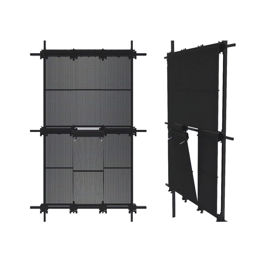 Paineis de Led para o exterior. Modelares e faceis de transportar e montar apenas 10 segundos para instalar cada cabine. Usados para instala à frente de fachadas em especial vidradas, devido à sua construção quase transparente, não obstrui a luz do exterior. São paineis bastante leves cerca de 7,8kg por cabine ou seja 16kg/m2. nivel de consumo baixo cerca de 150w/m2 em média. Adicionando várias cabines permite configurar paineis de grande dimensão e de formas diferentes. A transmissão de conteudos é feita através de uma box de envio ou processador de video e o envio de informação pode ser por computador, dispositivo movel via WIFI, Cabo de Rede ou Cloud.