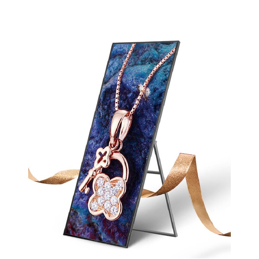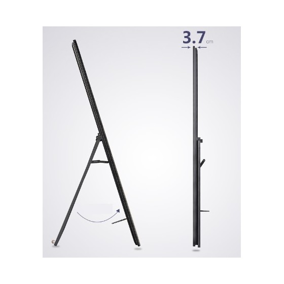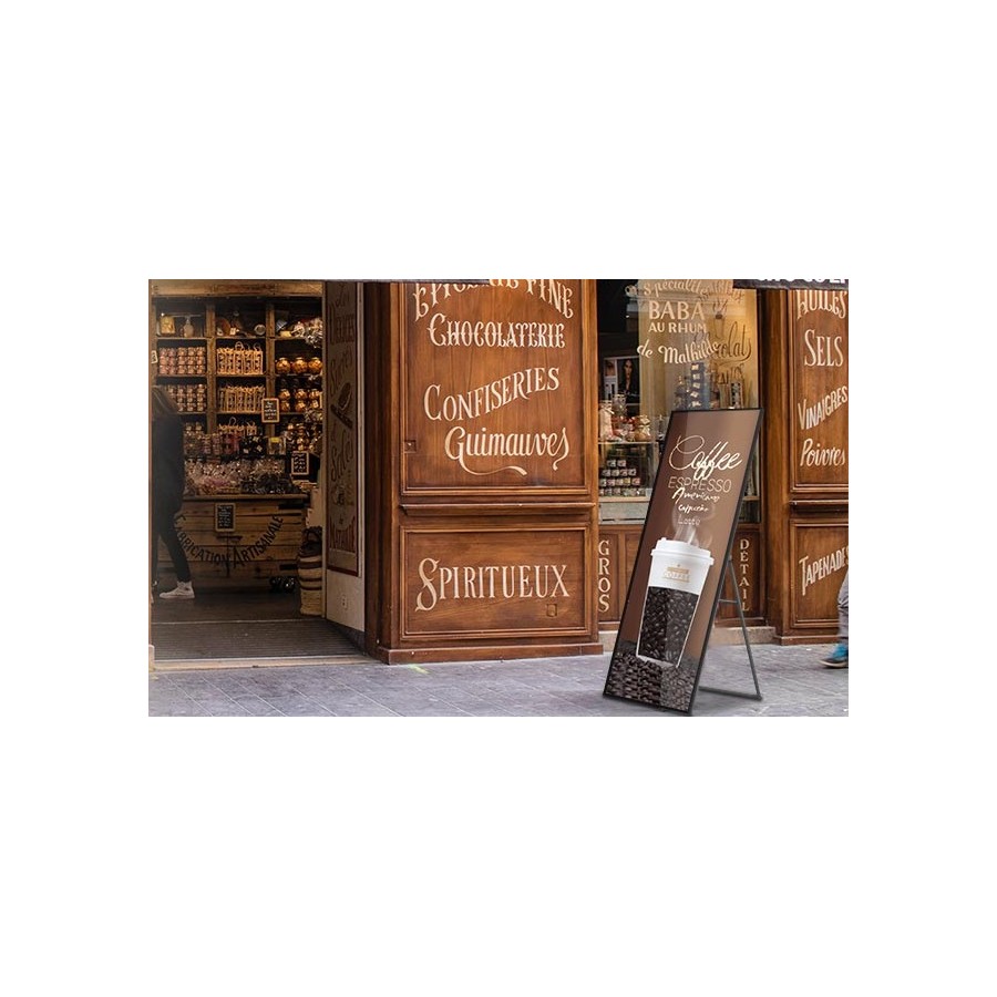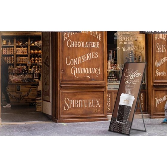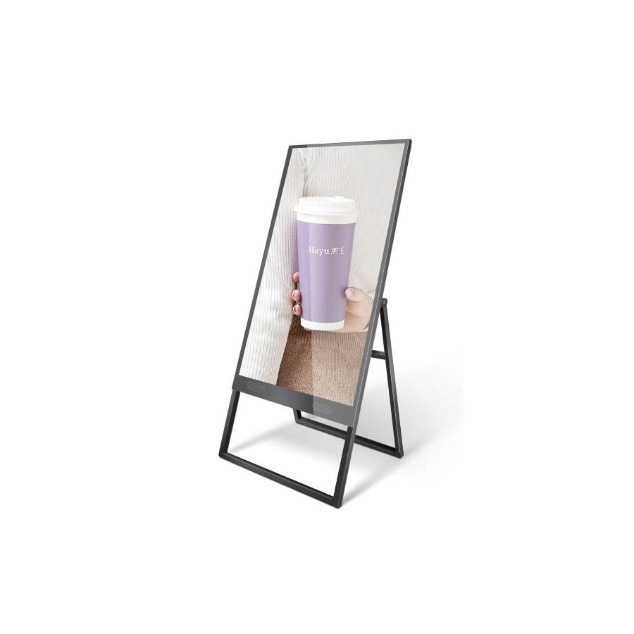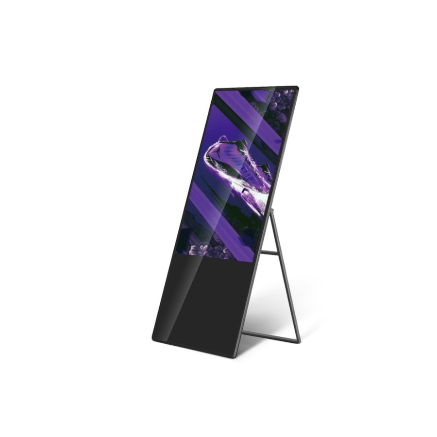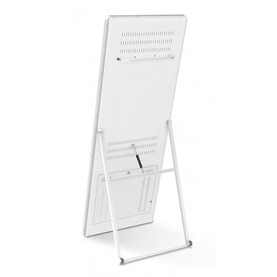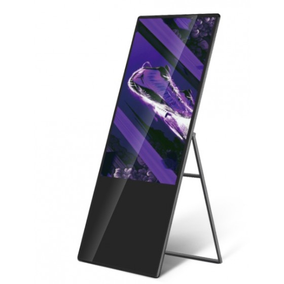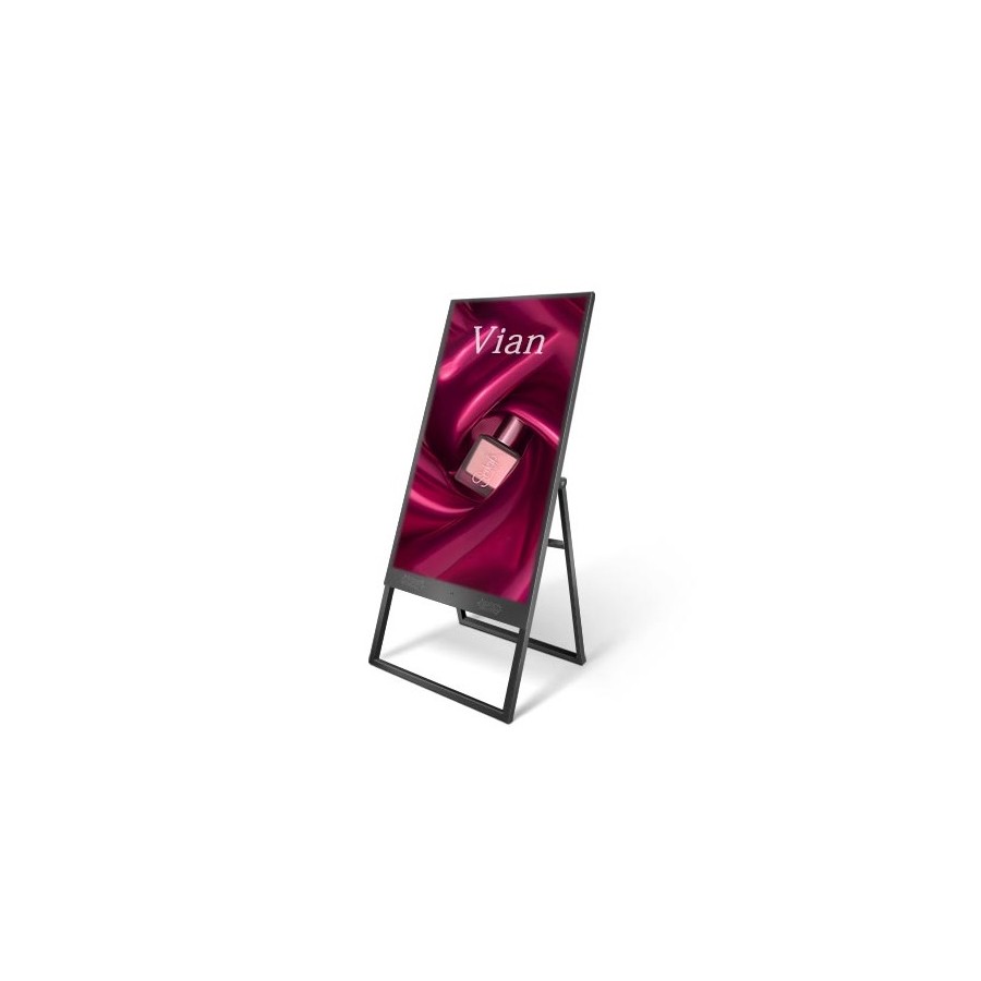 O Poster Digital é também fabricado com características ergonómicas na dianteira, incluem rodas localizadas na base, duas barras de puxadores e um apoio dobrável.